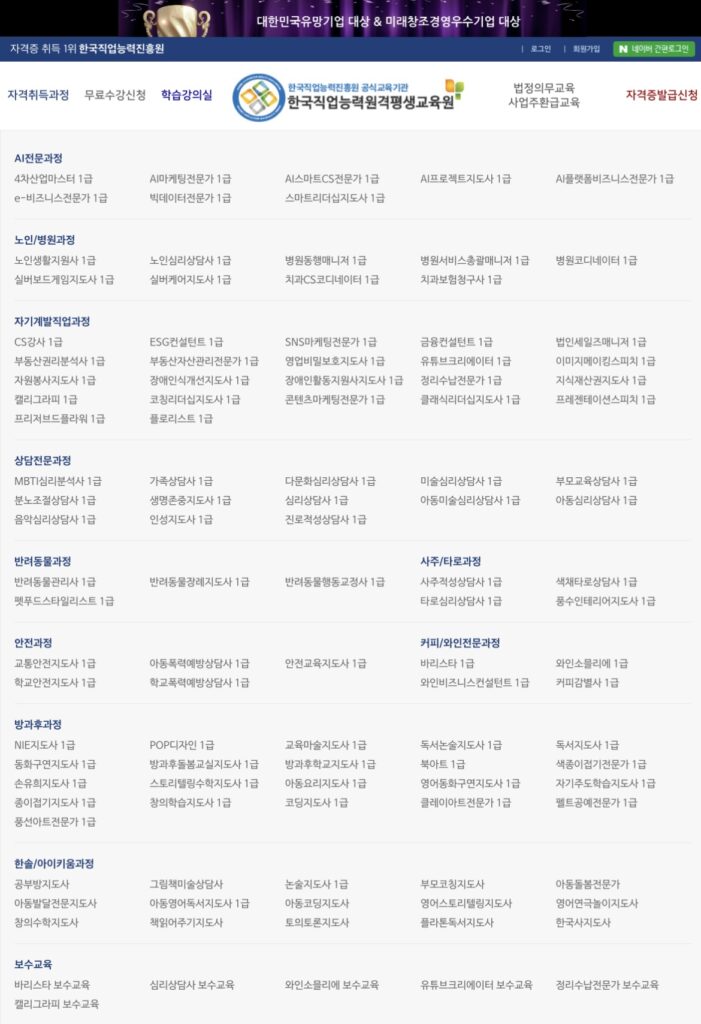 한국직업능력연구원 등록 1급자격증 무료수강 - 자격증 공식 발급 교육기관, 전과정 합격까지 100% 온라인 무료교육