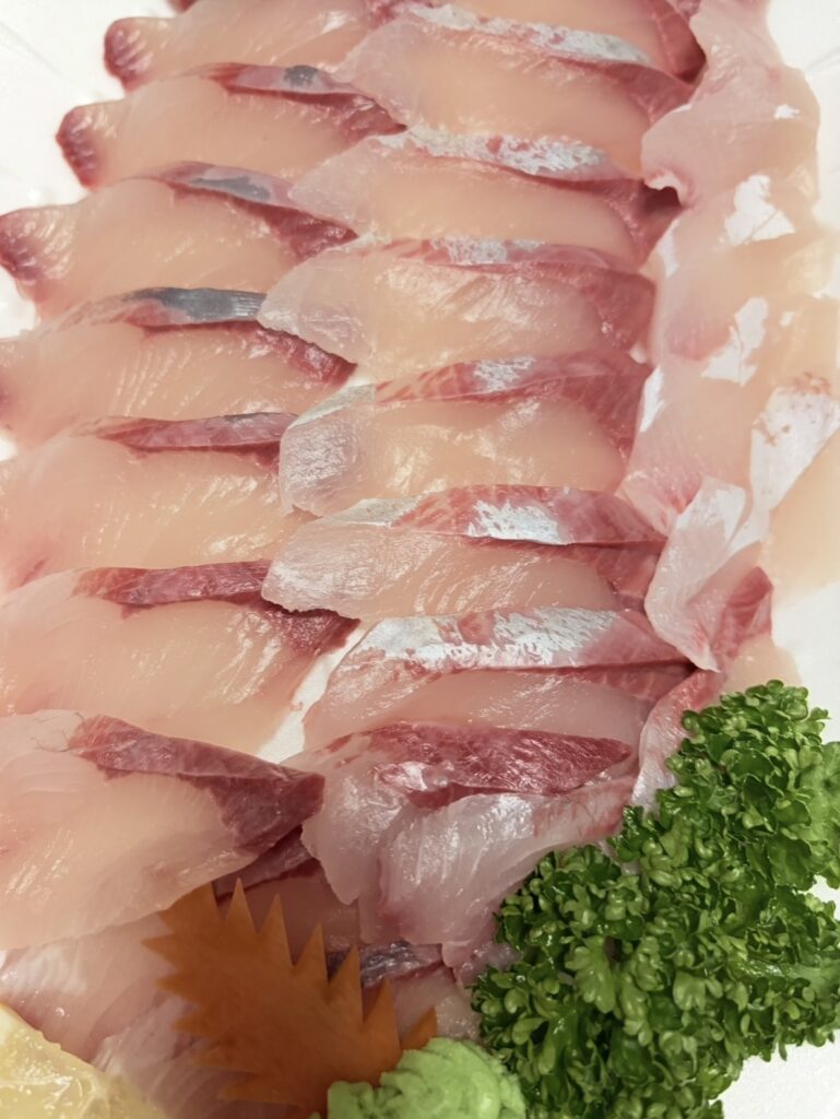 サーモン、白身のお魚、タコ、イカ、ブリのお刺身がありました