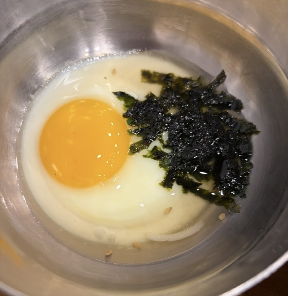 半熟の卵に海苔、胡麻油がかかったものをくれるお店があります