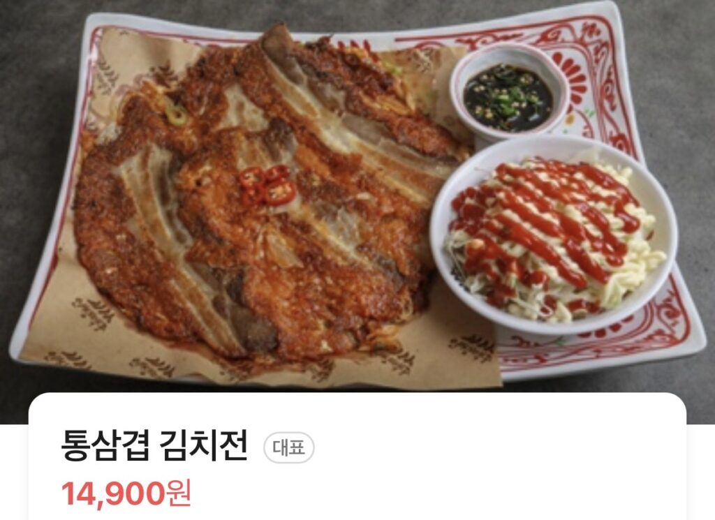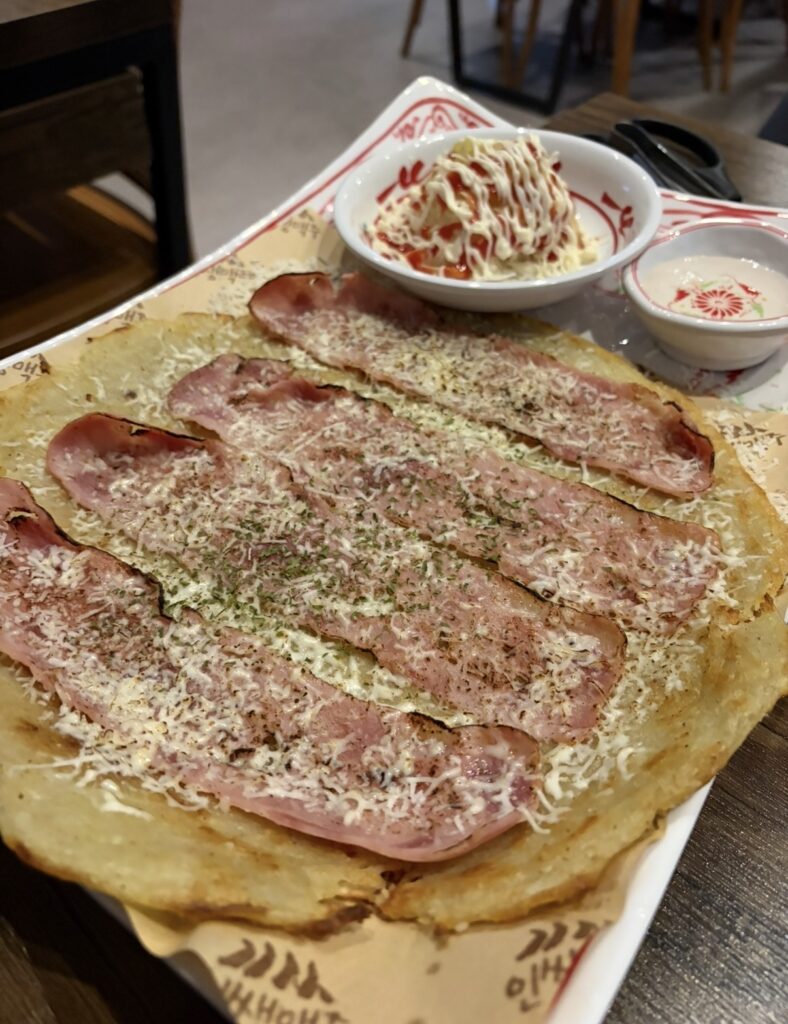 サムギョプサル3枚もそのまま入ってボリューミー!食べ応えあるキムチチヂミです