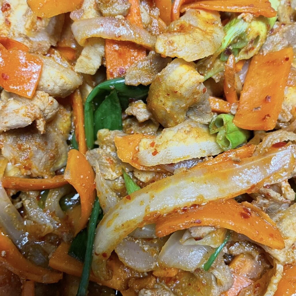 冷凍薄切りサムギョプサルとにんじん玉ねぎ長ネギを炒めて