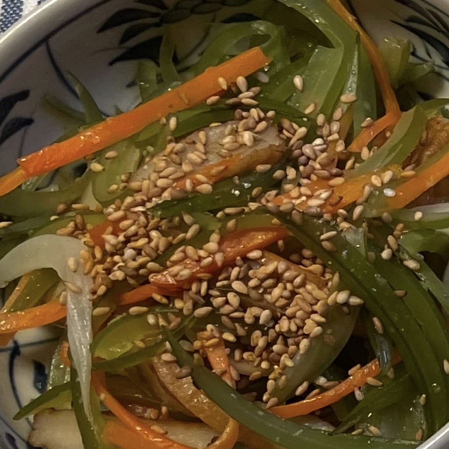 にんじん、玉ねぎ、長ネギを炒め、お砂糖(水飴)、お醤油、みりん、ごま油、胡麻で混ぜ混ぜおしまい!